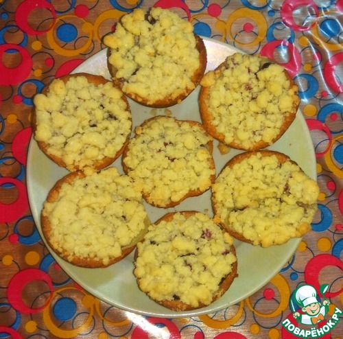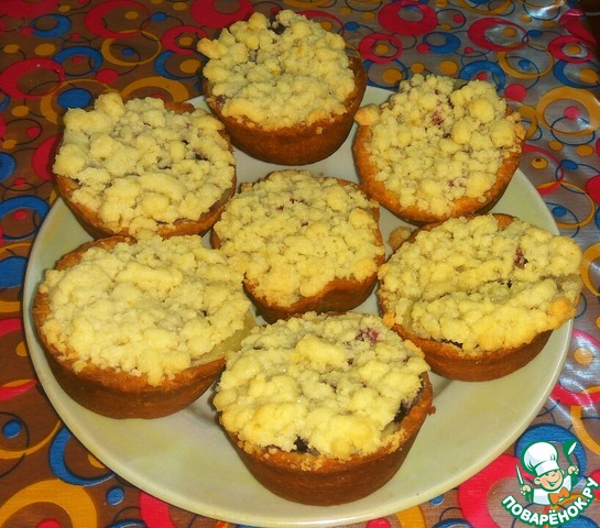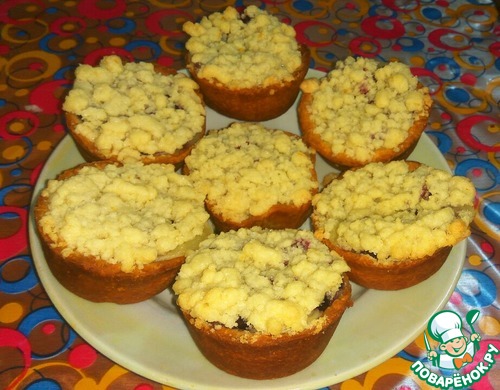 Выложить в получившиеся из теста корзиночки крем, сверху посыпать ягодами, немного вдавливая их в крем. Затем посыпать штрейзелем.