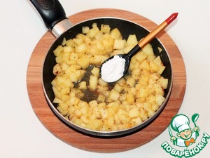 5. Для сладкой начинки. Разогреваем сливочное масло. Выкладываем очищенные от шкурки, семечек и мелко нарезанные кубиками яблоки. Добавляем сахар, перемешиваем и тушим до появления сока, минуты 2. Затем посыпаем кусочки яблок крахмалом и быстро перемешиваем до уменьшения жидкости, снимаем с плиты. Смешиваем яблоки с творогом.