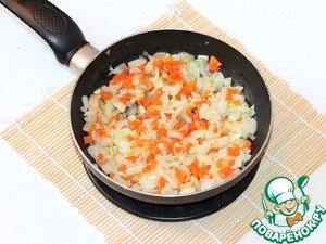 Очищенный лук мелко нарезаем и обжариваем на сливочном масле (2 ст. л.) до прозрачности. Добавляем очищенную и мелко нарезанную морковь и тушим, не забывая перемешивать.