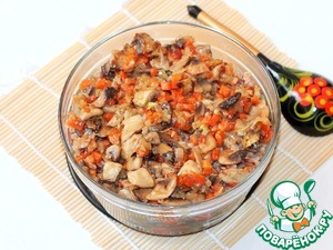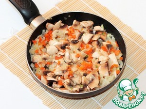 7. Очищенные грибы мелко нарезаем и добавляем к пассеровке. Добавляем прессованный зубчик чеснока и приправу для грибов. Тушим под крышкой до готовности грибов.