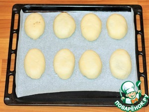 Выкладываем заготовки пирожков на противень и держим их под пленкой.