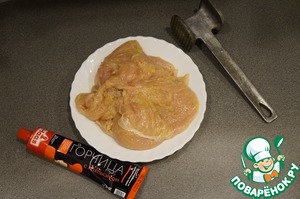 Куриное мясо слегка отбить с двух сторон. Посолить, поперчить, намазать горчицей. У меня горчица HAAS с апельсином.