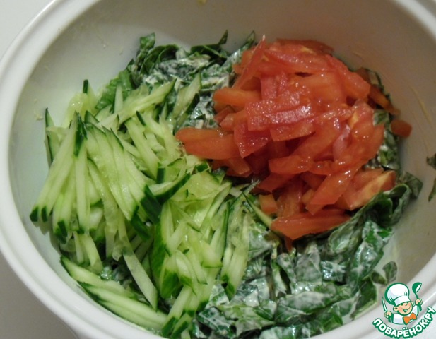 • Теперь нарезать крупной соломкой огурец и помидор. Аккуратно соединить с заправленным шпинатом.