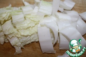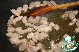 Свинину нарезать на тонкие полоски и обжарить порционно.