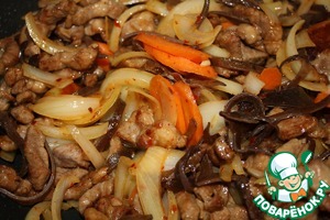 Затем возвращаем мясо и добавляем древесные грибы, они у меня уже были нарезаны соломкой.