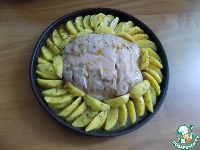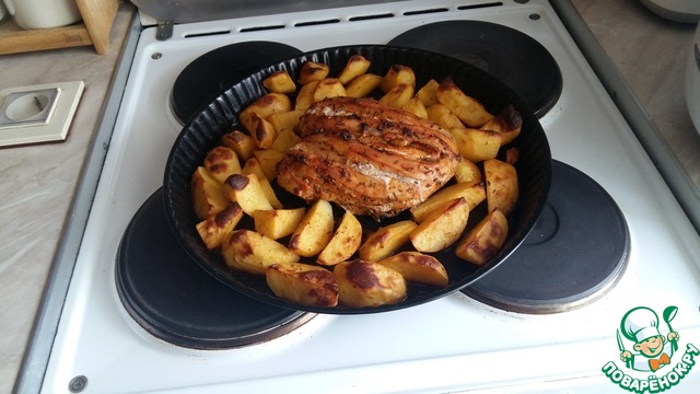 Выкладываем картофель по форме или протвеню в один ряд. Поливаем сверху лимонно-пряным оливковым маслом. Форму с содержимым ставим в разогретую духовку до т-180 С минут на 30. Я проверяю готовность вилкой, накалывая. Нам не нужно долго блюдо держать в духовке, чтобы грудка не пересушилась. По времени картофель и грудка готовятся одинаково. Если картофель запёкся, то и грудка готова!