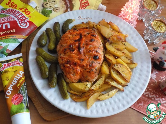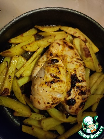 Куриная грудка, замаринованная при помощи майонеза, кетчупа "Краснодарский" и Русской горчицы ТМ МахеевЪ и запечённая вместе с картофелем по-гречески-простой и лёгкий гарнир, очень любим греками. Это можно сказать, что два блюда. Их можно сделать по отдельности, но я их соединила и получился потрясающий вариант!