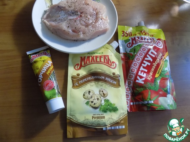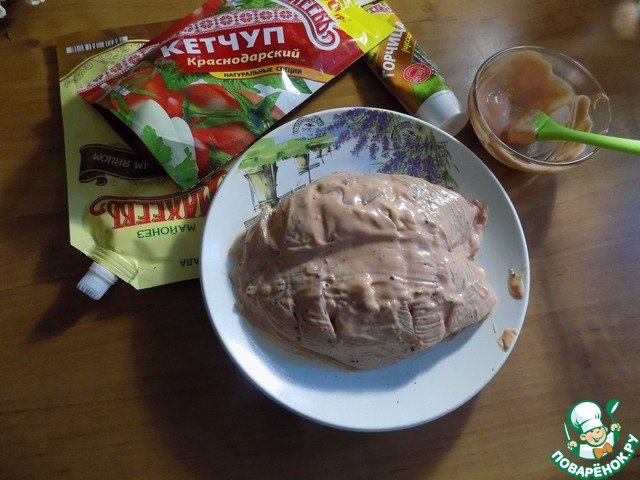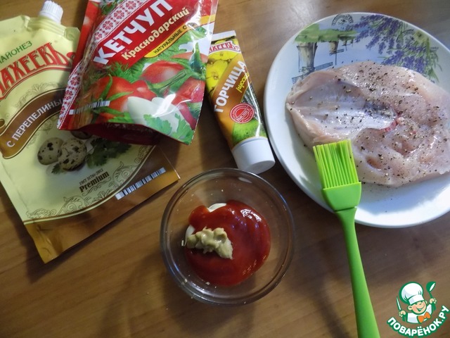Соединяем в посуде майонез, кетчуп и горчицу. Чеснок режем тонкими дольками "пятачками". Обмазываем грудку маринадом, используя кисточку.