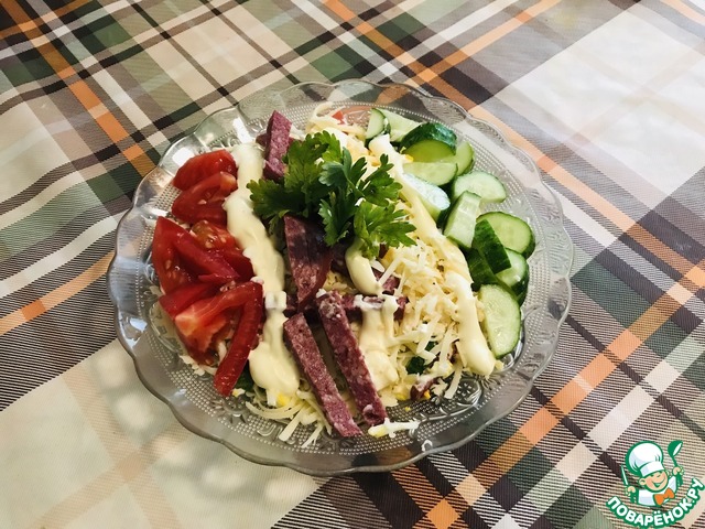 Визуально разделим салат на 4 части и украсим в виде полосочек из помидоров, колбасы, сыра и огурцов. Украсим между полосочками и по кругу майонезом.