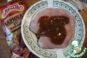 • Обильно смазать куриное филе маринадом для шашлыка от "Махеевъ", переложить в пакет и завязать. Оставить часа на 2-3 (лучше на ночь).