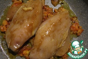 • Помидоры нарезать и потушить на растительном масле до мягкости. На помидоры уложить подготовленное куриное филе.