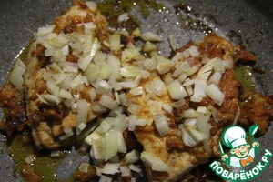 • Нанести эту смесь на филе и тушить на медленном огне до готовности (при прокалывании ножом должен выделяться прозрачный сок). Если необходимо, можно добаваить немного воды и накрыть крышкой.