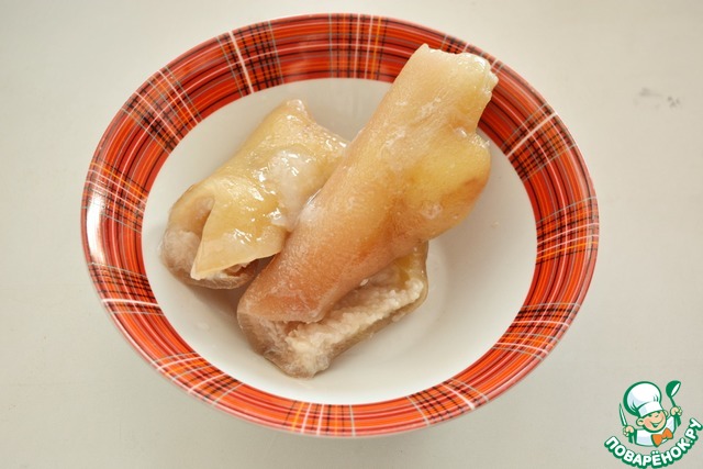 Свиную шкуру залейте водой и отварите до мягкости 1 час. Остудите в холодильнике и измельчите в мясорубке 2 раза, уберите в холодильник.