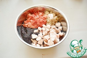 Свиную лопатку прокрутите в мясорубке 2 раза. И тоже уберите в холодильник на 1-2 часа.