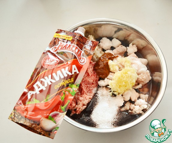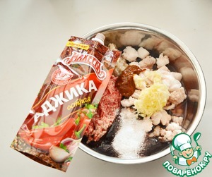 Добавьте нитритную и поваренную соль, измельченный чеснок. Вместо специй я решила добавить аджику ТМ "Махеев", в этом зельце она оказалась очень уместна