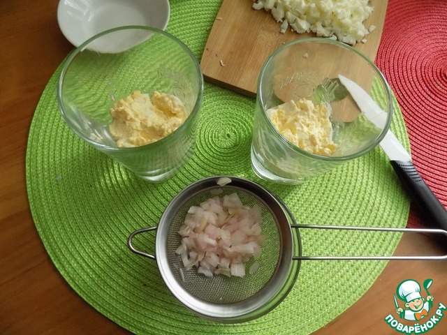 Салат я буду подавать в стаканах для виски. На самый низ выкладываем сырок плавленный порезанный небольшим кубиком, далее-слой желтка, заправленного майонезом. С лука сливаем маринад. Я использовала для этого ситечко. На желток выкладываем лук маринованный.