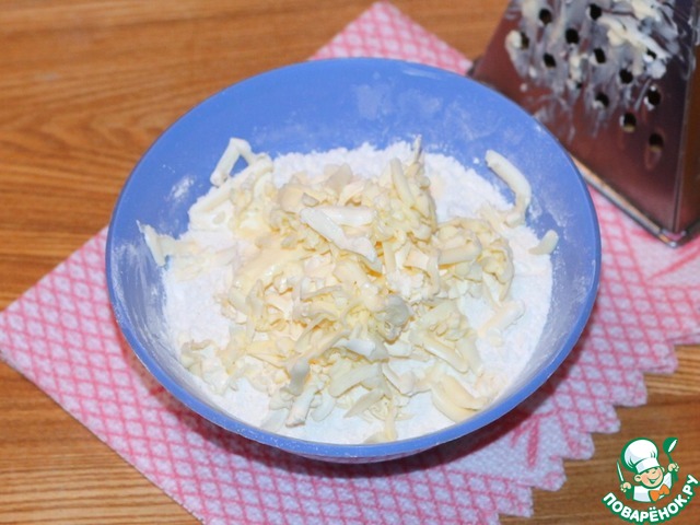 2. Холодное сливочное масло натираем в миску с мукой на крупной терке, перетираем руками. Чтобы очистить терку от масла, обсыпаем ее мукой (из миски), остатки масла впитает мука.