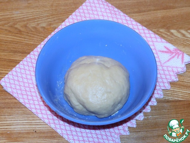 6. Если все сделано правильно, собираете тесто в ком. Собирается очень хорошо, тесто пластичное, блестящее и не липнет к рукам, можно немного смазать растительным маслом (0,5 ч. л.). Кладем тесто в миску и отправляем в холодильник на 30 минут.