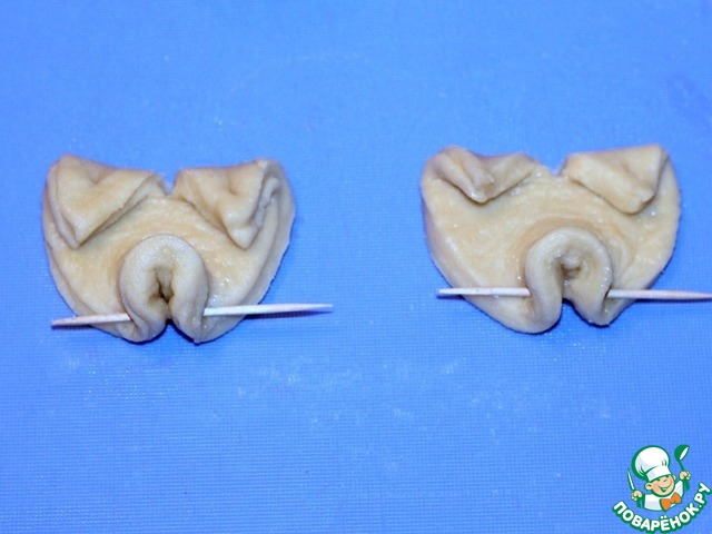9. Смазываем ушки взбитым с щепоткой сахара белком и загибаем. Белок здесь, как клей.