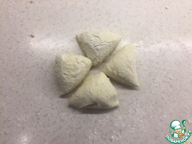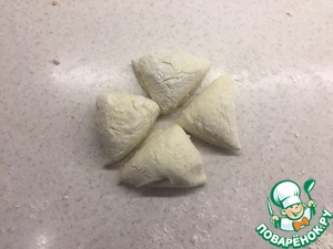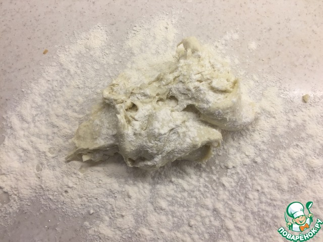 На рабочей поверхности замесить тесто 3-4 минуты, добавляя немного муки, чтобы тесто не липло к рукам.