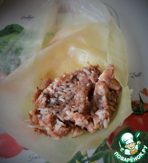 На лист капусты выкладываем по 1,5 ст. л. начинки и сворачиваем голубец.