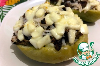 Рис откинуть на сите, выложить в фарш, добавить сушеные грибы.