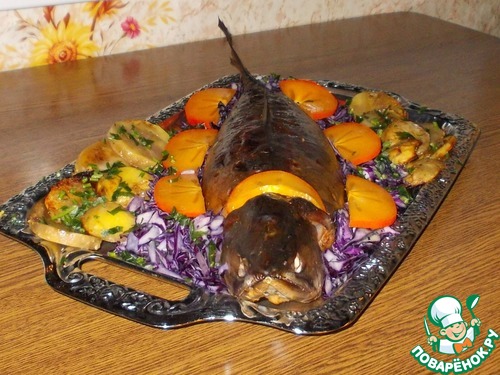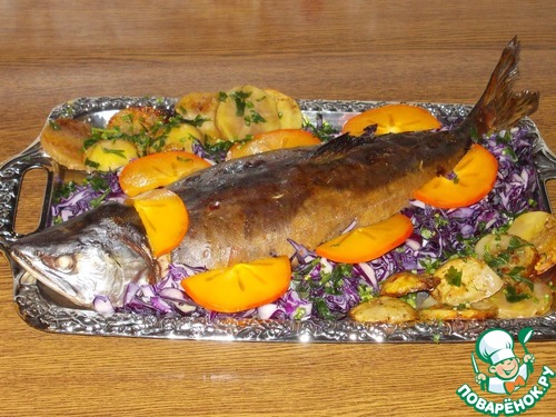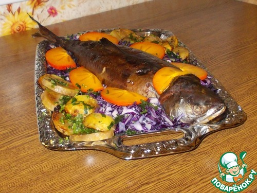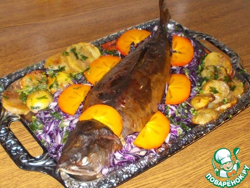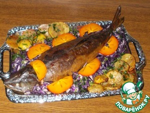 Можно рыбу оставить до полного охлаждения, а можно еще теплую выложить для подачи на блюдо и декорировать на свой вкус. У меня рыба пошла на обычный семейный ужин и поэтому декор не слишком хитрый... Очень эффектно смотрится рыбка на зеленых листьях салата в окружении свежих овощей, лимона и хурмы. Но у меня оформлена вот так, просто для примера, прошу строго не судить!