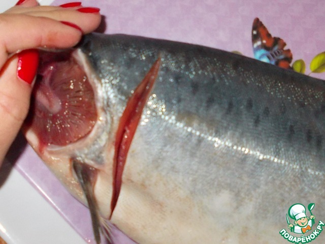Первым делом варим вкрутую 2 яйца и маленькую морковку отвариваем до готовности. Теперь приступаем к рыбе. Способов фарширования рыбы существует несколько. Я хочу показать и рассказать, как фаршировать рыбу "чулком". Перед тем, как приступить к подготовке "чулка" из горбуши, надо полностью разморозить рыбу! При необходимости почистить от чешуек и вымыть. Затем делаем надрез довольно глубокий за жаберными пластинами и за передними плавниками. Важно, чтоб делая разрез не прорезали внутренности рыбы, а только кожу и мясо!