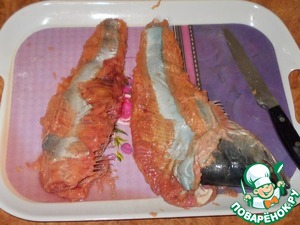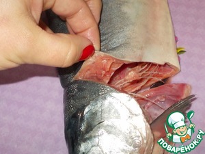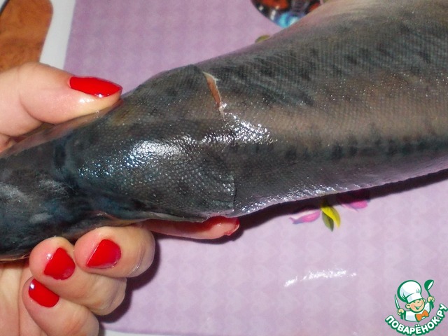 Аналогично делаем надрез со второй стороны рыбы. Обратите внимание, что на спине по линии хребта кожу не прорезаем!