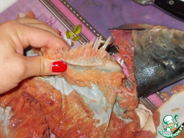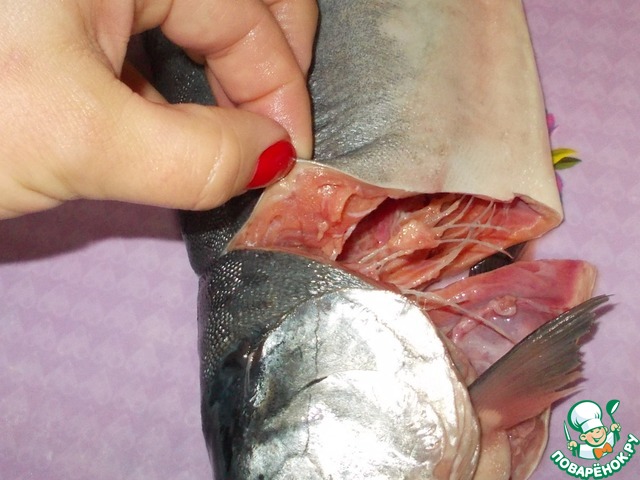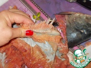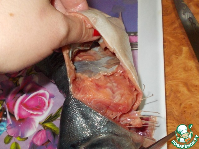Срезаем внутренние кости плавников, оставляя несколько миллиметров, чтоб не повредить кожу и чтоб наружная часть плавника не потеряла свой вид.