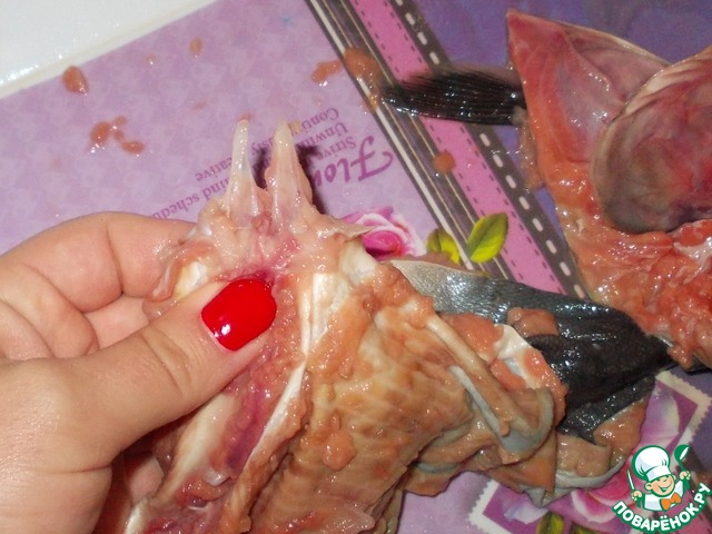 Затем счищаем мясо со шкуры. Плотно держащиеся части мяса можно не срезать.