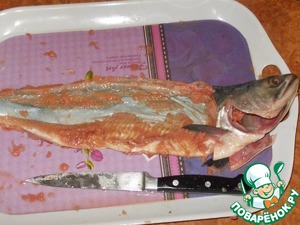 Отделив каркас рыбы до хвоста, выворачиваем кожу наизнанку и отрезаем хребет, оставив несколько сантиметров хребта у хвостового плавника, чтоб хвост красиво смотрелся при запекании.