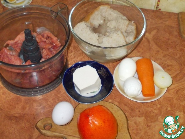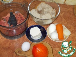 Мясо рыбы перекладываем в чашу процессора, замачиваем в воде хлеб, чистим отваренные яйца и морковь. В случае использования колбасного сыра снимаем с него копченную корочку.