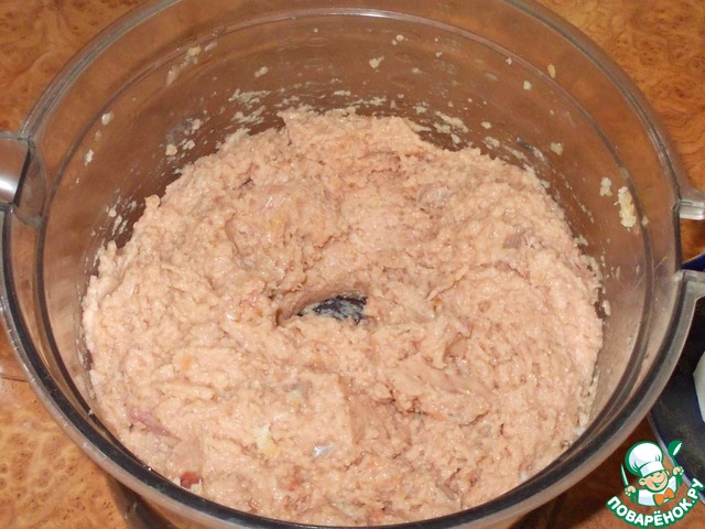 Начинаем начинять фаршем наш "чулок". Порцию фарша ложкой вкладываем сквозь разрез, как можно глубже.