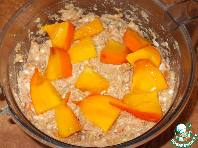 В последнюю очередь добавляем довольно крупные кусочки хурмы и аккуратно вмешиваем в фарш.