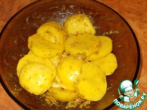 Чистим и режим (кружочками) картофель. Солим по вкусу и добавляем соус или аджику. Главное, чтоб соус был пряно-чесночный (я для этого применяю аджику из бархатцев)