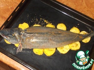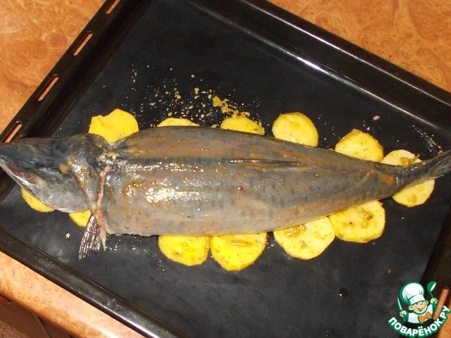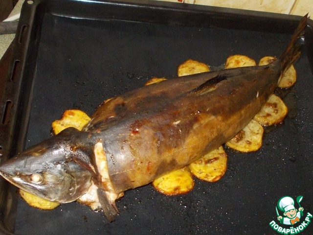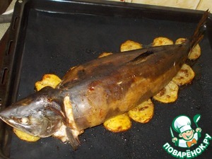 Противень застилаем пергаментом или ковриком для выпечки. Смазываем немного растительным маслом. Выкладываем картофельную подушку по форме рыбы. Сверху картофеля кладем рыбину животом вниз. Кожу рыбы по спине смазываем соусом ткемали или любым соусом по Вашему вкусу (можно майонезом). У разогретой до 170 градусов духовки снижаем температуру до 160 градусов и ставим подготовленную рыбу в духовку.