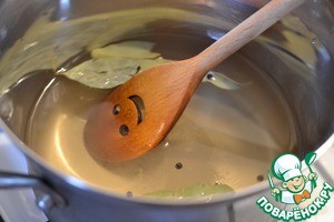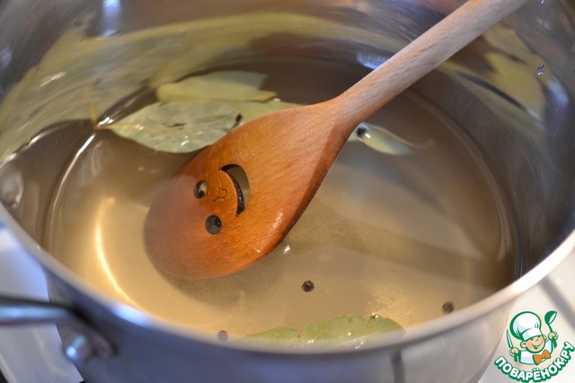 В кастрюльку налить воду, уксус, соль, лавровый лист и горошки черного перца. Поставить на огонь и довести до кипения.