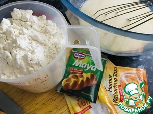 В чашу высыпать -дрожжи, сахар, соль, ваниль, все хорошо перемешать венчиком.