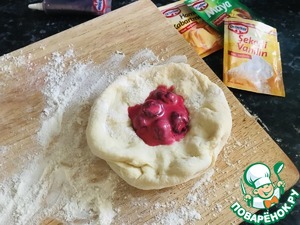 Работать с тестом легко, подпылить поверхность стола мукой, разделить на шарики, немного раскатать, выложить начинку.