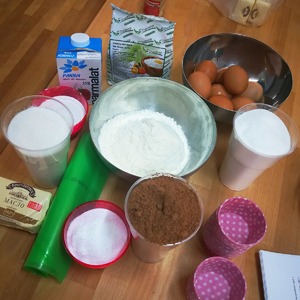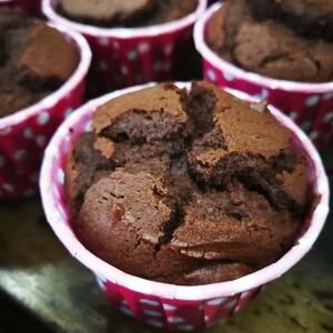 Тем временем все сухие ингредиенты (мучную смесь, какао, ванильный сахар, разрыхлитель) просеять в отдельной миске вместе.⠀ Соединить жидкую смесь с сухой, тщательно перемешать. Заложить тесто в формочки на две трети и выпекать при 180 градусах в течение 25 минут.