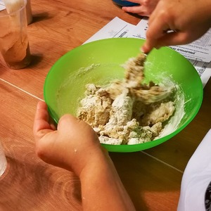 Муку всыпайте в массу небольшими партиями, каждый раз перемешивая с помощью лопатки или руками. Добавляйте муку до тех пор, пока тесто не станет послушным, то есть будет скатываться в хороший шар, не прилипая к рукам. -