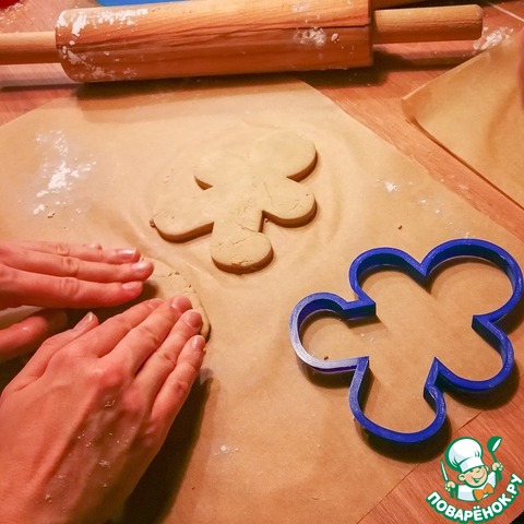 Выложите часть теста на пергамент, накройте второй частью пергамента сверху и раскатывайте в пласт толщиной около 5 мм. Можно вырезать фигурки! -
