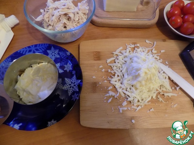 • На яйца выкладываем куриное мясо+майонез. Далее-четвертинки черри или кубики нарезанного помидора+майонез. Верхний слой сыр+майонез и присыпаем немного просто натёртым сыром, если вы его немного оставите для украшения. Я сверху ещё выложила по целой помидорке-черри.