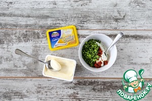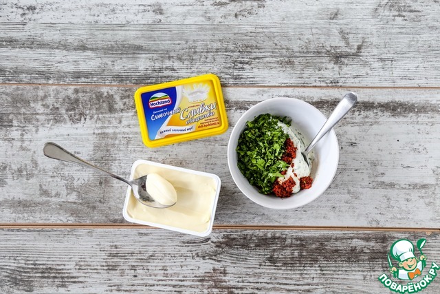 Для начинки мелко порубите чеснок и кинзу. Смешайте плавленый сыр с аджикой, добавьте кинзу с чесноком, поперчите и тщательно перемешайте. Дайте настояться 15–20 мин.