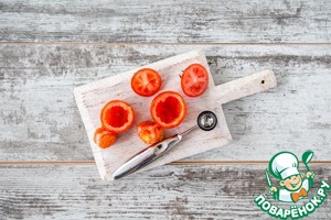 С помидоров срежьте «крышечки» – примерно 1/3 верха – и сохраните. Маленькой заостренной ложкой выньте сердцевину (здесь она не понадобится, ее можно использовать для супа).