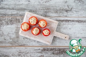 Плотно нафаршируйте помидоры начинкой, сверху установите «крышечки». Подавайте сразу.