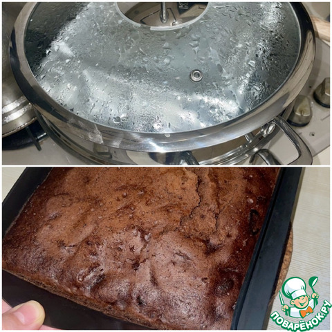 Вышел такой: рассыпчатый немного, но и влажный одновременно (не знаю как еще описать), снизу вообще мокренький от мёда, когда ешь, то кусочки шоколада попадают и таааааааююююют…..ммммм….