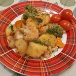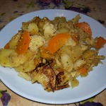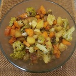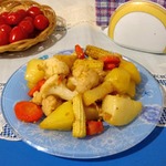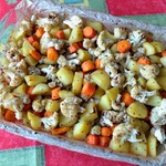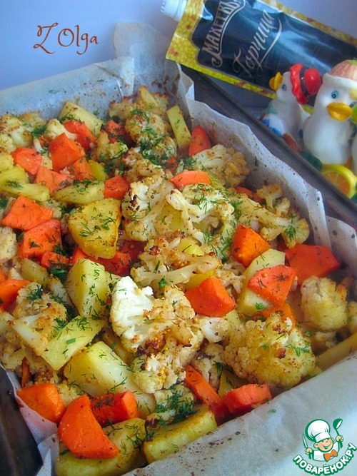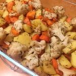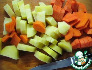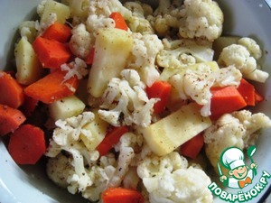 Нарезать небольшими кусочками картофель и морковь, цветную капусту разобрать на более мелкие соцветия, по размеру примерно как остальные овощи.
