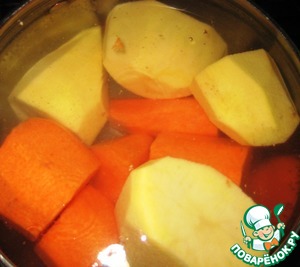 Отправить картофель с морковью в кастрюлю с водой, дать закипеть. Через 4-5 минут снять кастрюлю с огня, воду слить. -
